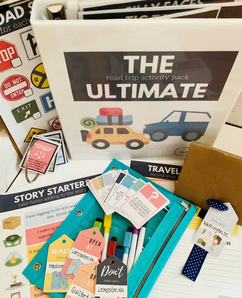 I created this for my kids when we were getting ready for a fourteen hour road trip. Simply print the pages, put them in a zippered binder inside clear sheet protectors. I added a binder pencil pouch and filled it with these dry erase markers. The kids were able to draw, play games and fill in the activity sheets over and over again.