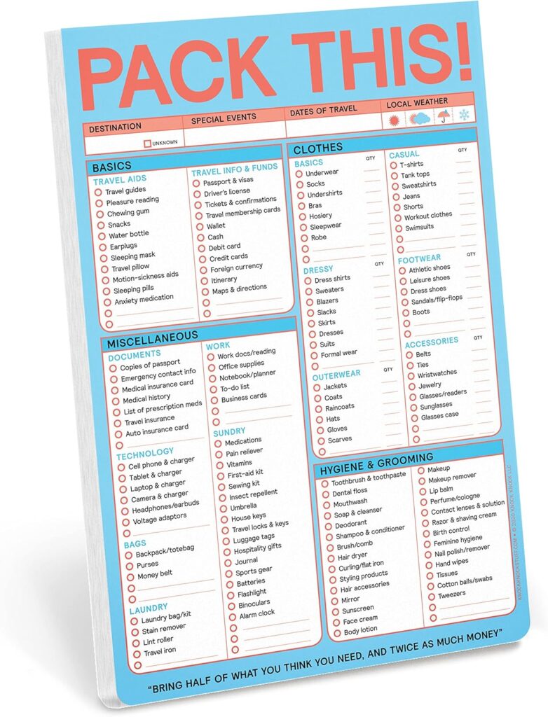 Never forget anything again with a packing list. A simple, printable checklist can help you organize your packing process and ensure you have everything you need for your trip. You can even use a travel-specific list that includes all the essentials, from clothes to gadgets to toiletries. I love this one because it is pre-populated and can help you remember items you might not have thought about.