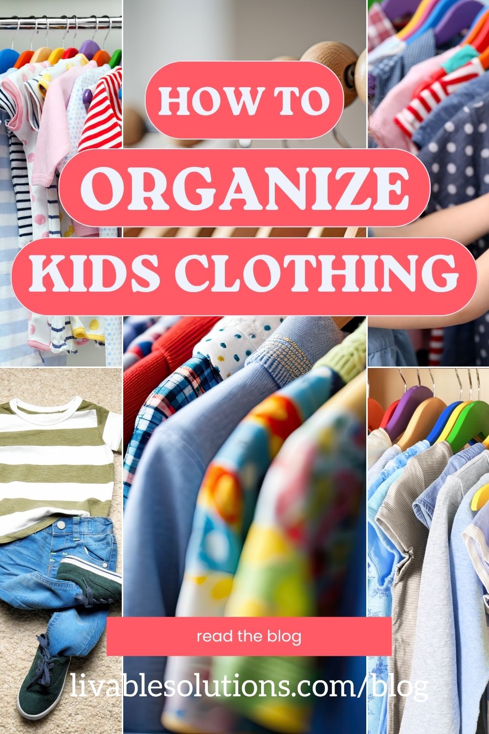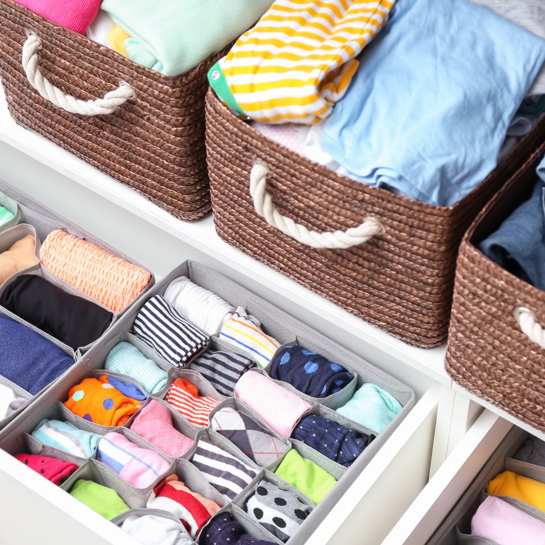 Start to organize kids’ clothes by pulling out everything—yes, everything—from your child’s closet and drawers. Separate clothing into categories: shirts, pants, school uniforms, outerwear, pajamas, socks, etc.